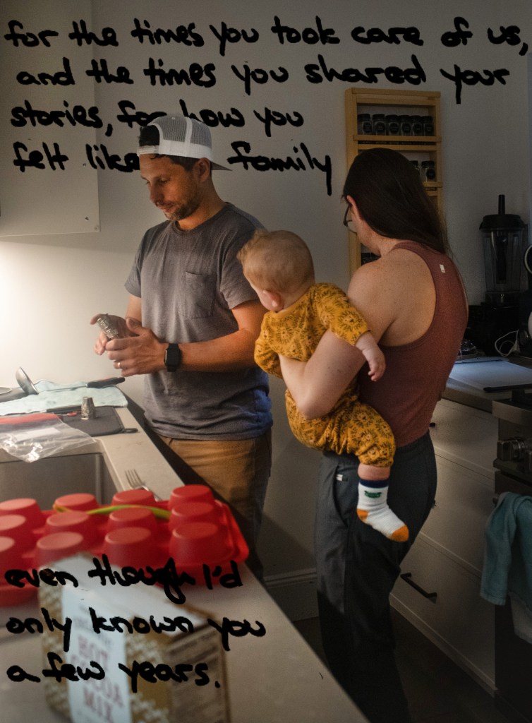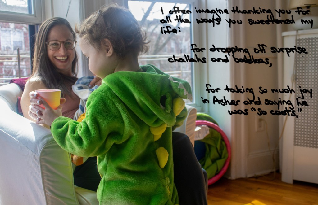 “I often imagine thanking you for all the ways you sweetened my life: for dropping off surprise challahs and babkas, for taking so much joy in Asher and saying he was ‘so coots’, for the times you took care of us, and the times you shared your stories, for how you felt like family even though I’d only known you a few years. And then I imagine you walking up the stairs as you wave off my words- because you never did it for the thank you.”