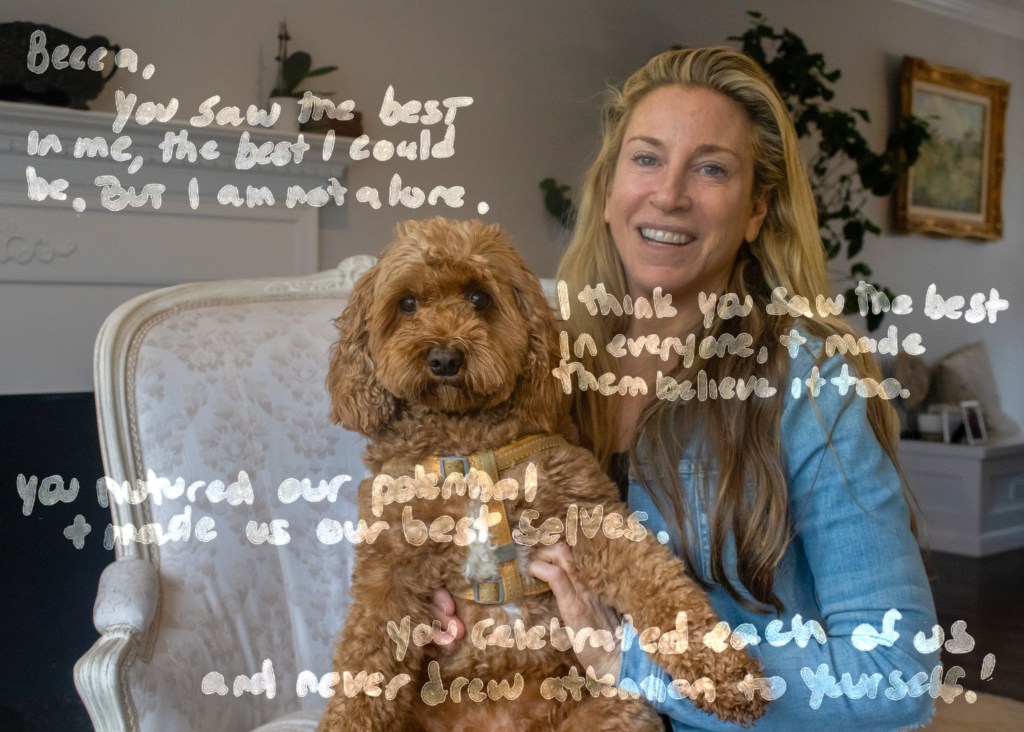 Each slideshow explores someone’s unique relationship with Becca. For each person, you’ll find a short candid photoshoot overlayed with a handwritten note to my mother.