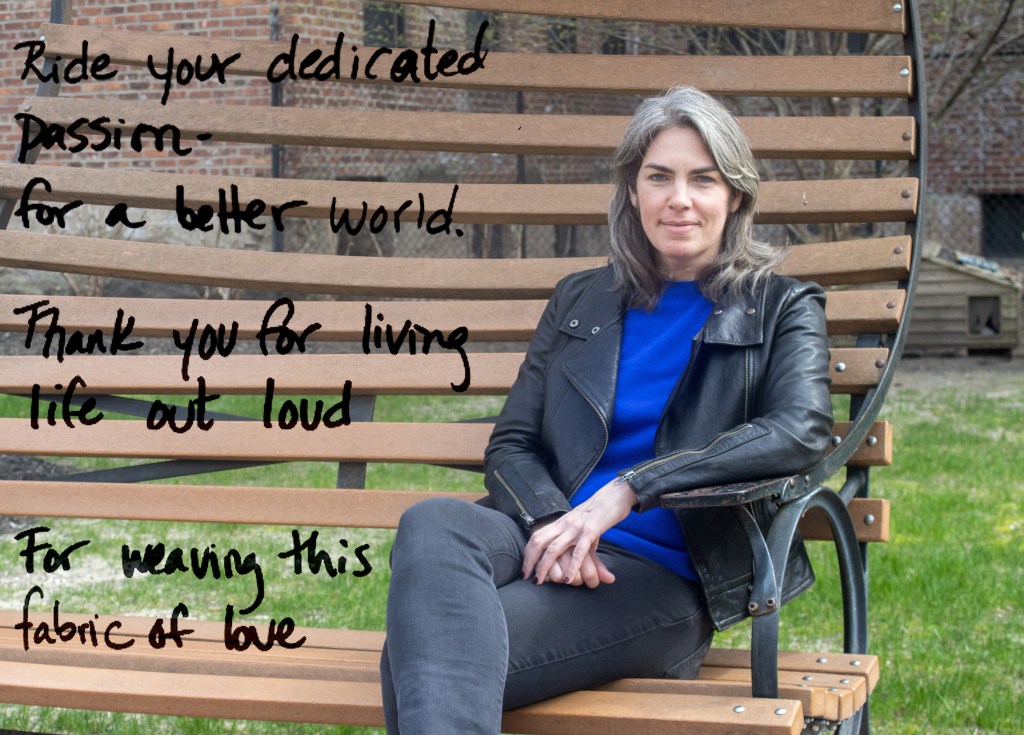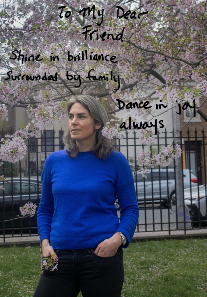 “To my dear friend: Shine in brilliance, surrounded by family. Dance in joy, always. Ride your dedicated passion for a better world. Thank you for living life out loud- for weaving this fabric of love which you have masterfully left holding all of us.”